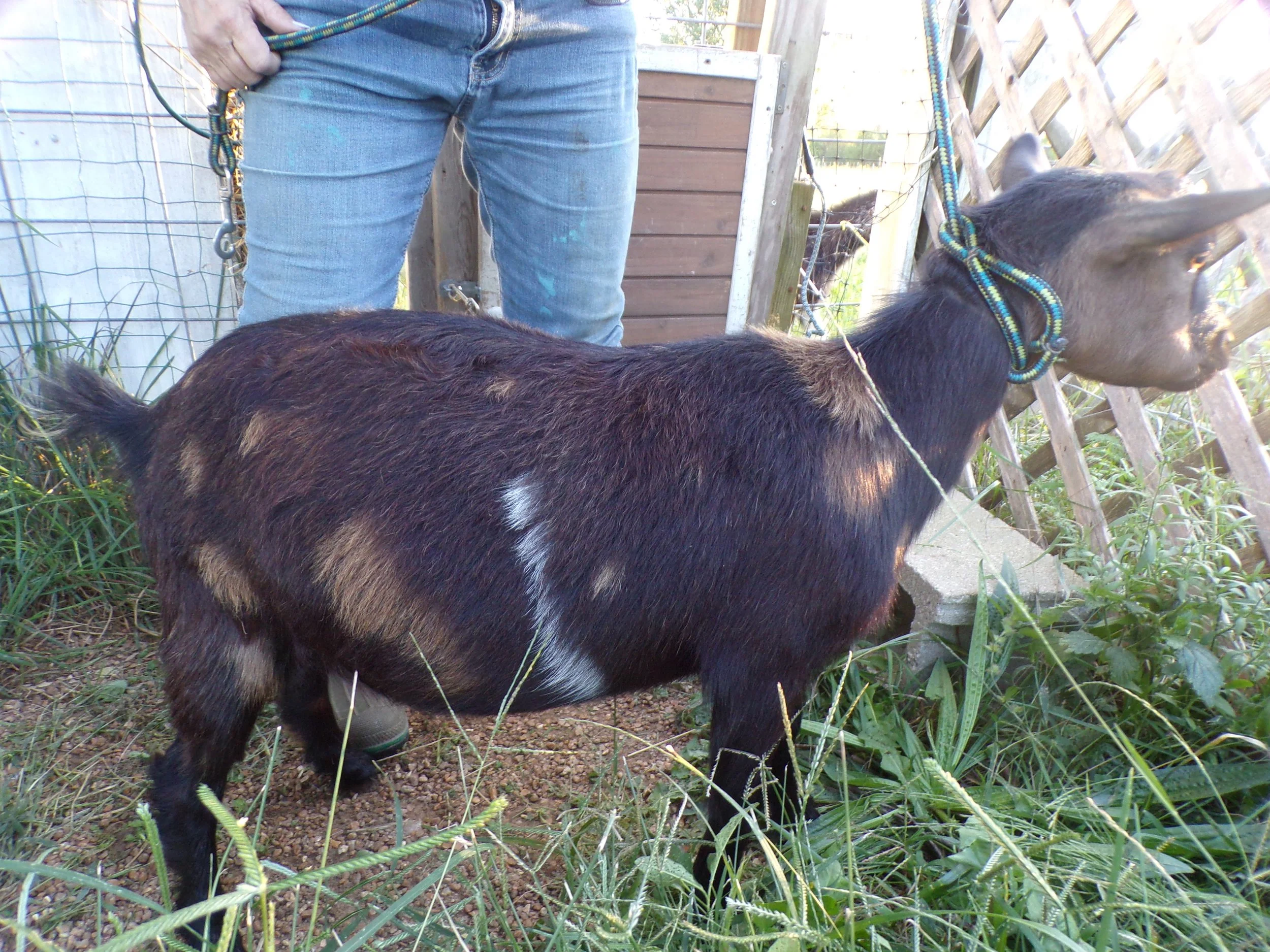 This is one of my unregistered pairings and if you are looking for moonspots this is the pair. Poppy has always given me some form of moonspots even if it is just one spot. Now she also has an amazing udder and is so sweet and her kids turn out to be sweet. Now let’s add Apollo who will add size and great dairy genetics along with blue eyes to go with the moonspots. This cross is great, and I plan to retain a doeling as she has given me more bucklings than doelings.